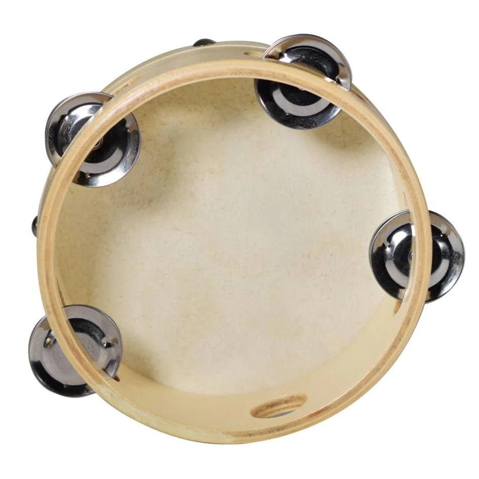 A wooden ring tambourine with a hide head with 8 jingles (4 pairs).